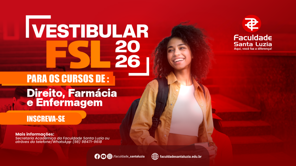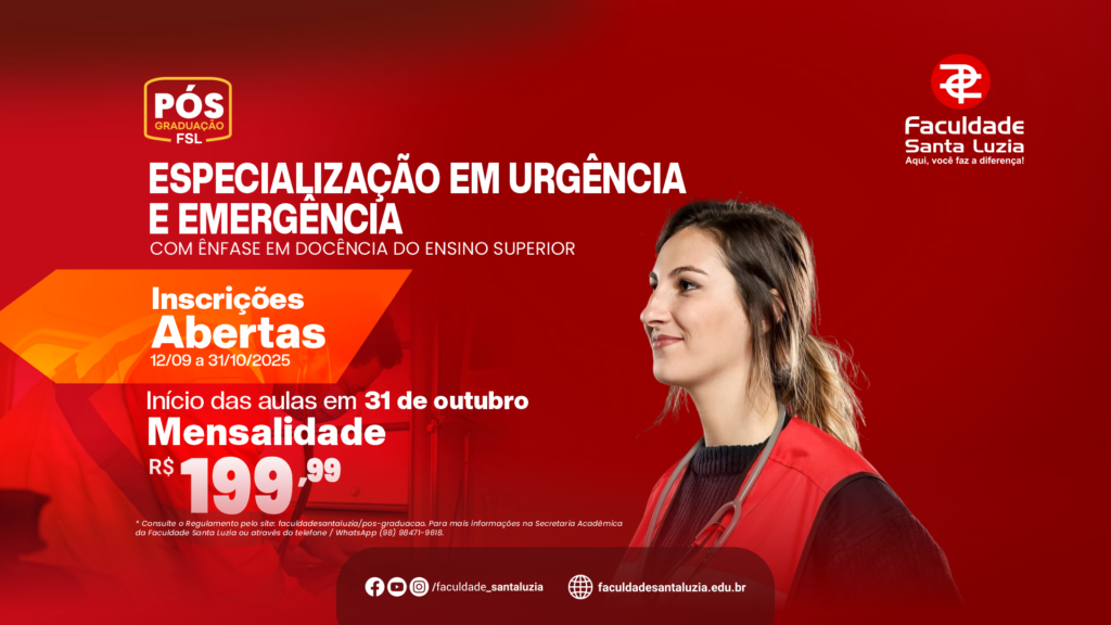 Processo Seletivo Docente FSLPÓS GRADUAÇÃO EM URGÊNCIA E EMERGÊNCIA COM ÊNFASE EM DOCÊNCIA DO ENSINO SUPERIORTratamento de feridas e curativos na assistência de enfermagem Vestibular Agendado 2026Seleção de Projetos de Iniciação Científica Notícias Ver mais… Processo Seletivo Docente FSL Vestibular Agendado 2026 Estagio supervisionado dos acadêmicos do 9º período de enfermagem Faculdade Santa Luzia firma parceria com o UNIESF